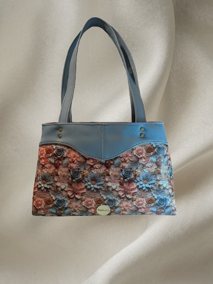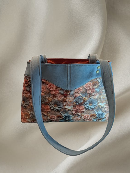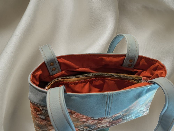 The classic sweetheart silhouette is paired with soft blue vinyl accents and a floral exterior panel, creating a structured yet romantic look. Inside, the bag is fully lined in a warm rust-orange fabric and designed with functionality in mind. The interior features a center divider zipper pocket, a larger interior zipper pocket, and two slip pockets, making it easy to keep essentials organized and accessible.