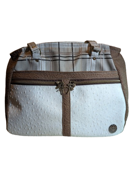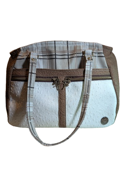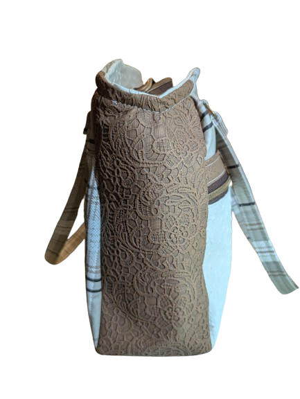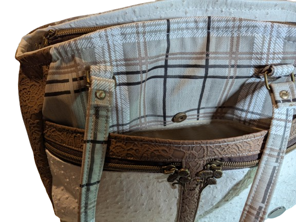 The Girasol Bag (pattern by Shamballa Bags) is a beautifully structured tote-style handbag that blends timeless elegance with everyday function. This handmade version features a charming plaid exterior paired with embossed lace-textured vinyl sides and base for extra durability and style.