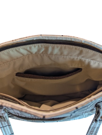 Measuring approximately 13” wide x 10” tall x 4” deep, it’s perfectly sized to carry your daily essentials without feeling bulky. The front offers both a zippered pocket with antique brass floral zipper pulls and a magnetic snap slip pocket, giving you quick access to items on the go. Inside, the roomy main compartment includes a zippered pocket and additional slip pocket, keeping everything organized.