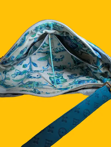 Inside, a beautiful blue-and-green floral cotton lining adds a pop of personality, complete with a secure zip pocket for smaller essentials and an open divided pocket for organization. The spacious interior easily fits your phone, wallet, keys, and more — perfect for everyday use or travel.
