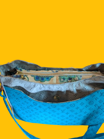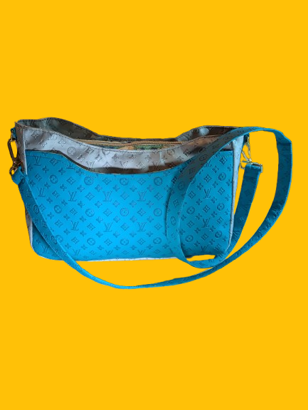 Crafted from high-quality turquoise and silver faux LV embossed vinyl, it features a smooth curved top zipper closure and a front slip pocket that follows the natural curve of the bag. The design includes vertical side straps with D-ring connectors and a matching strap that allows you to wear it crossbody or over the shoulder comfortably.