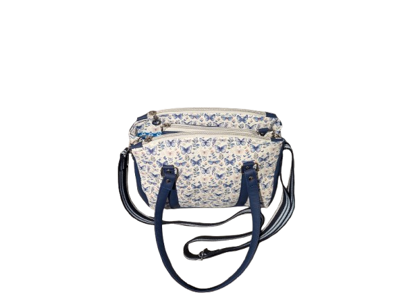 The Rowena Bag (pattern by Knotted Threads) is a stylish and functional design, and this handmade version takes it to the next level with a delicate butterfly print and rich navy accents. Thoughtfully crafted for everyday use, it combines structure, storage, and versatility in one beautiful piece.